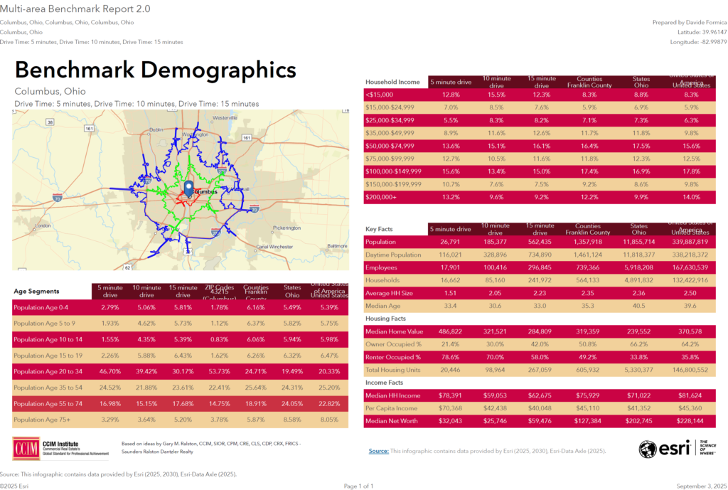 Columbus, Ohio continues to show strong fundamentals for real estate investors targeting income-diverse, high-demand rental zones. The latest benchmark with data provided by Esri (2025) reveals critical demographic and income segmentation patterns within 5, 10, and 15-minute drive times from downtown Columbus.