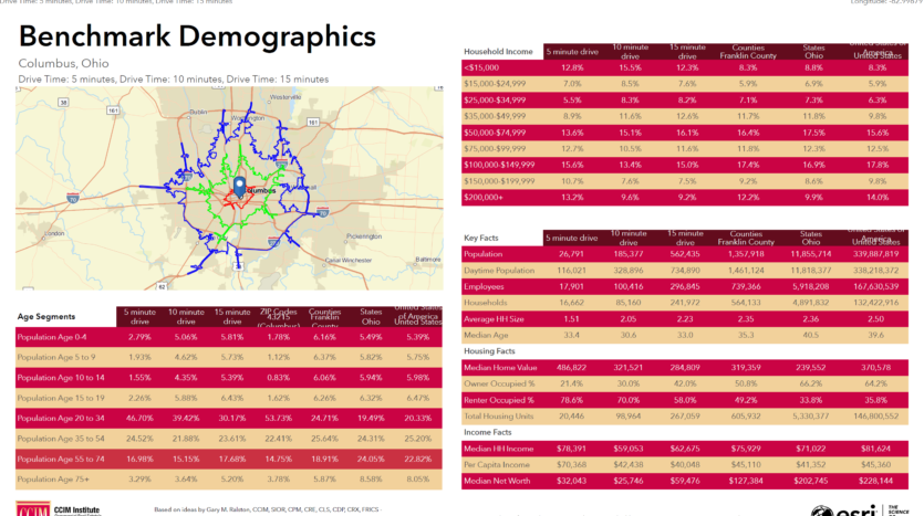 Columbus, Ohio continues to show strong fundamentals for real estate investors targeting income-diverse, high-demand rental zones. The latest benchmark with data provided by Esri (2025) reveals critical demographic and income segmentation patterns within 5, 10, and 15-minute drive times from downtown Columbus.